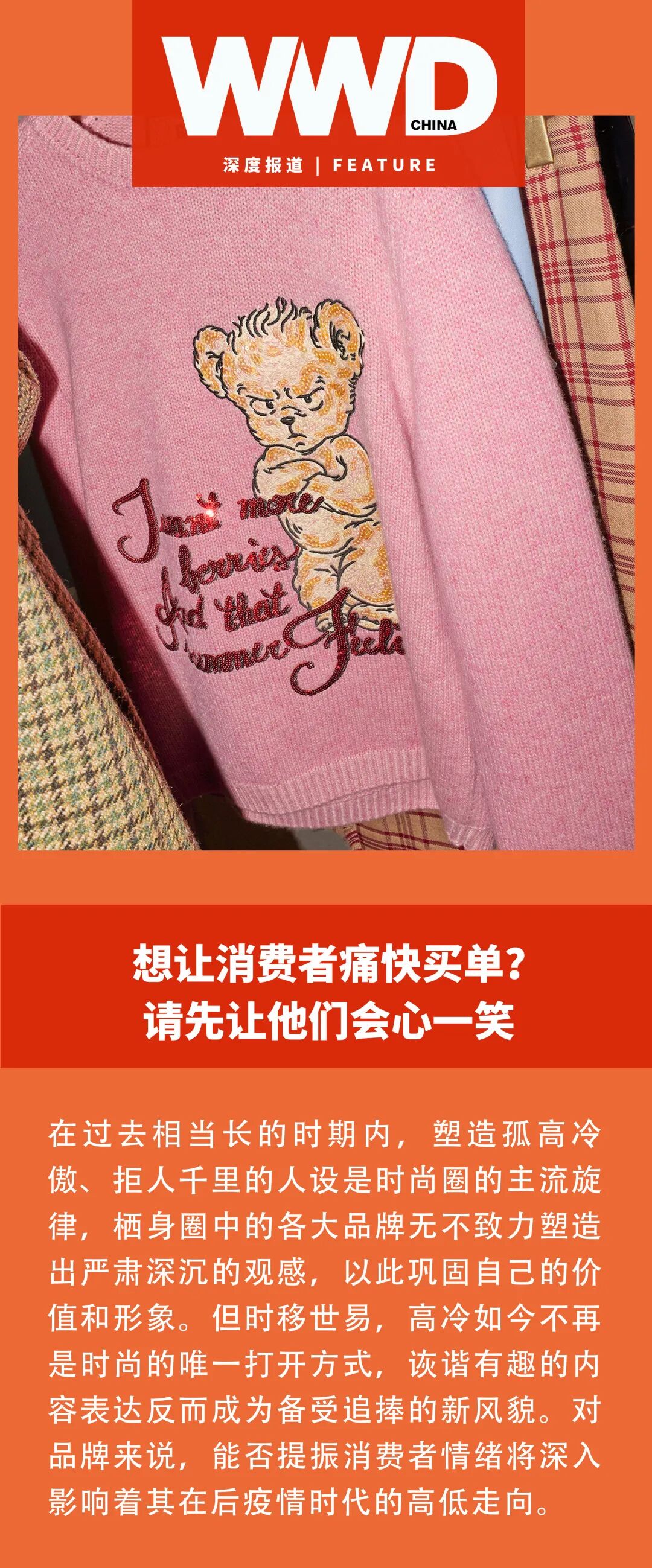 无独有偶,因模仿 Beyoncé 和 Lady Gaga 而一炮而红的日本搞笑艺人渡边直美,也受到了时尚圈的垂青,频繁受邀出席品牌活动。2020 年的时候,美国轻奢品牌 Kate Spade 更是任命渡边直美为全球大使。在广告中,渡边直美与品牌的标志手袋 Margaux 展开有趣互动,利用丰富的面部表情和肢体语言展现手袋轻量、耐用、配色缤纷等主打卖点,活泼灵动且不失格调,给人留下深刻的印象。 除了通过与谐星合作,打造有趣味度的联名系列亦是品牌惯常选择的路径。以 Gucci 为例,品牌创意总监 Alessandro Michele 近期就与英国唱作人兼演员 Harry Styles 合力推出了一个名为“HA HA HA”的特别系列。据品牌官方资料介绍,“HA HA HA”不仅代表了 Harry Styles 与品牌创意总监 Alessandro Michele 的姓名首字母缩写,更是充满愉悦欢笑与积极态度的拟声词。 Alessandro Michele 表示,“这次的特别合作源自我们某次通话,我们希望可以如同孩童般玩乐,用稀奇古怪的细节拼凑出我们的想象。于是,我们重新定义对于男士都会正装的遐想,将 1970 年代的潮流与波西米亚风尚融入其中,打造一座‘梦想衣橱’。”Gucci HA HA HA 特别系列跳出时尚创作的固有框架,以玩趣主张勾勒对于男士着装的全新想象,系列中除了剪裁精致的西装和经过特别处理的丹宁夹克,还融入了饰有奇特动物印花的保龄球衬衫、缀有青蛙五金配饰的连帽外套及配有皮带的苏格兰百褶裙等,以充满自由气息的元素及轻松自在的风格诠释男士正装的新面貌。