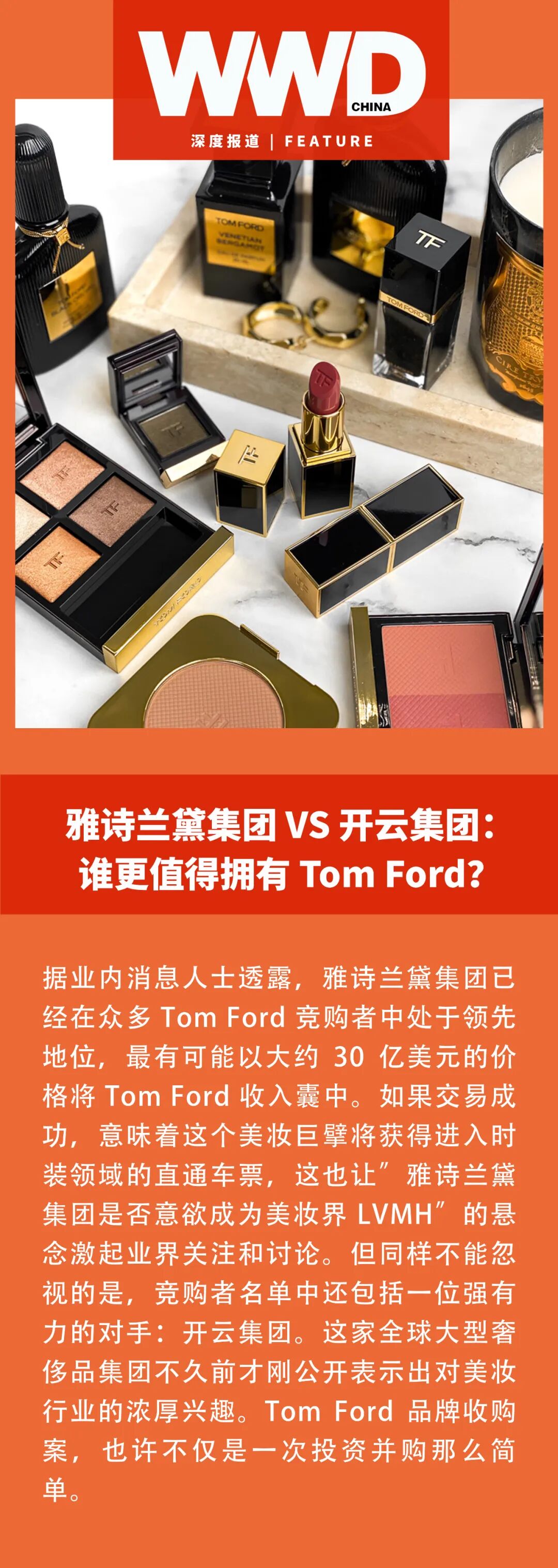 表现不如预期的第三财季成绩并不能阻止雅诗兰黛集团的扩张野心继续高涨。 据消息人士透露,化妆品巨头雅诗兰黛正在就收购 Tom Ford 与后者进行谈判,并最有可能以 30 亿美元的价格成交。若交易成功,这将成为雅诗兰黛史上金额最大的一笔收购。不过也有银行业界人士也指出,并非只有雅诗兰黛集团有意收购 Tom Ford,其他竞购者同样实力雄厚,比如开云集团。目前 Tom Ford 和雅诗兰黛集团均暂未对此事作出评价。 Tom Ford 的美妆产品同样塑造了一个性感强势的市场形象 在七月初,市场就传出由设计师 Tom Ford 创立的同名奢侈品牌将寻求出售、并已委任高盛负责相关收购事项的消息。据悉,出售协议包括 Tom Ford 本人继续参与品牌产品设计的权利。 明星设计师 Tom Ford 曾在 1990 年和 2000 年分别担任开云集团旗下两大品牌 Gucci 和 Yves Saint Laurent 的创意总监,并成功复兴了彼时垂垂老矣的 Gucci,为品牌注入了强势性感的魅惑美学。在 2004 年辞去两个品牌的创意总监一职之后,Tom Ford 在 2005 年正式创立自己的同名品牌,其产品业务也逐渐从男女高级时装扩展到眼镜配饰、香水美妆、高端腕表等领域。 设计师 Tom Ford 长期以来,Tom Ford 一直是纽约时装周最重要的“门面品牌”之一,Tom Ford 本人也曾担任多年的 CFDA 主席,因此 Tom Ford 可以说是美国时尚界的一个标签式人物。不过自疫情以来,Tom Ford 的时装秀就因为不同的原因而取消或延期,在今年年初,Tom Ford 就取消了原定于在 2 月份举办的纽约时装周走秀活动。在五月份,Tom Ford 还宣布辞去美国时装设计师协会 CFDA 主席一职。 在品牌影响力上面,Tom Ford 瞄准的是那些有品位的中产阶级和富裕阶层,其时装设计风格多年来并没有太大变化,都是一如既往的奢华性感,其女装更是如此。因此对于年轻人来说,Tom Ford 并没有太大的吸引力,对 Tom Ford 有着更高品牌忠诚度的更多是高端消费者。但相比时装较窄的目标受众,Tom Ford 的美妆香水产品却在美妆领域占据着重要地位,其口红和香水产品向来都备受各个年龄层级消费者的青睐。