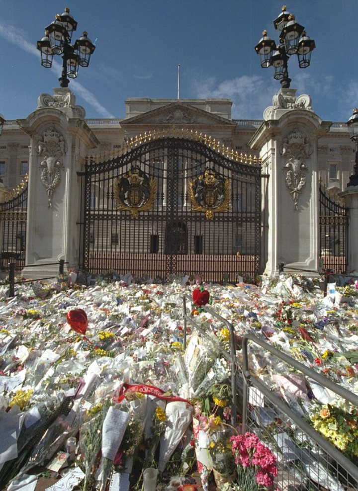 戴安娜离世后,白金汉宫门口的鲜花堆成了海洋。