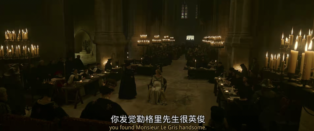 玛格丽特的父亲、丈夫卡鲁日和强奸她的勒格里,这些插手她生命的男人,坐在台下一言不发,仿佛玛格丽特是一件呈堂证供的物品。