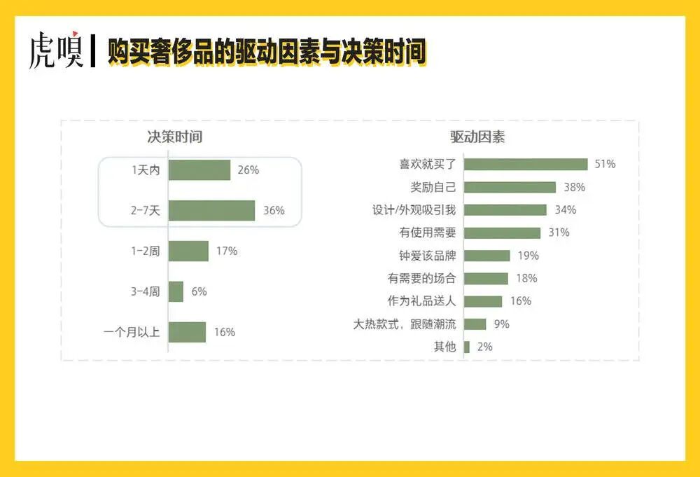 在奢侈品的消费动机和决策时间上,超过一半的人从了解到购买的时间为一周之内。