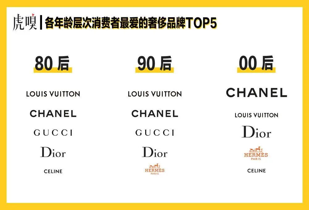 同样的观点,也流行于80后、90后的受访者之中;这一点,也可从各年龄层最爱的奢侈品牌的数据中窥见,三个年龄群消费者喜欢的TOP 5奢侈品都是大家耳熟能详的品牌。