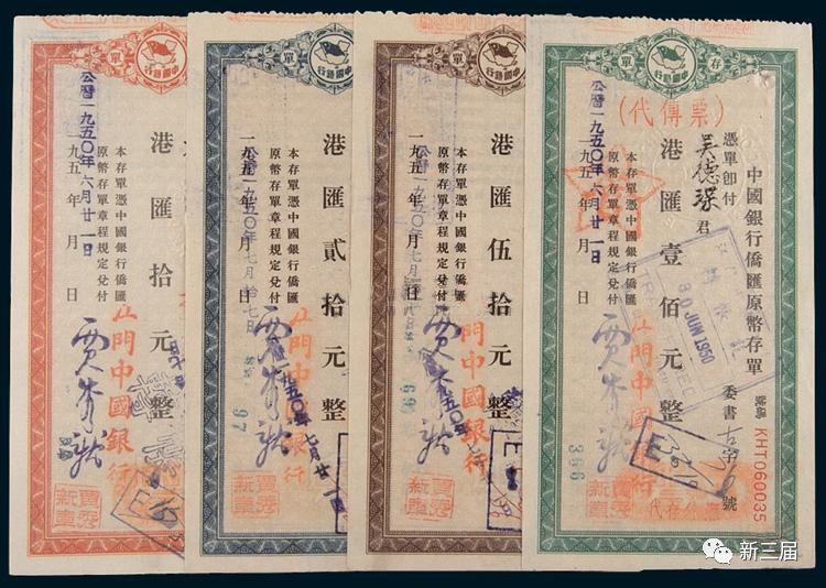 1950年中国银行侨汇原币存单港汇拾元、贰拾元、伍拾元、壹百元