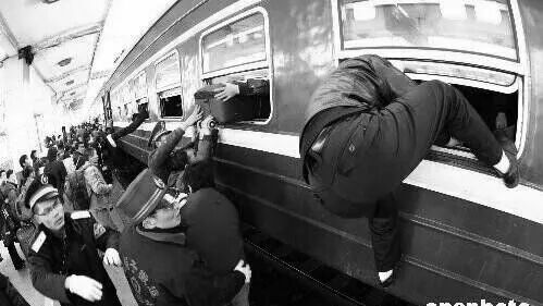 火车终于进站了。每人抓起自己的行李,不顾一切地朝车门奔去。通常是两个男生拼死用胳膊抓住车门的两边把手,挡住其他乘客,让女生先上。女生甭管平时多娇气,这时也豁出去了,拽着几十斤黄豆,玩儿命地往车上挤。