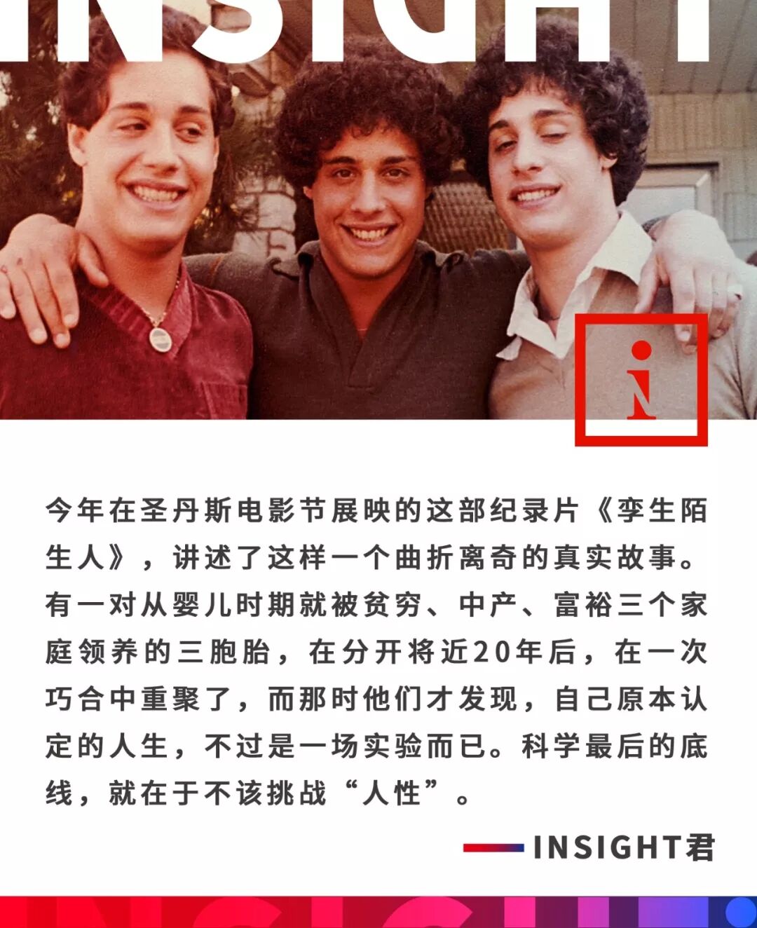 得知这个消息后,三兄弟和他们的家人陷入了愤怒——整整分离了19年,错失了漫长岁月中的彼此陪伴与共同成长,只是为了满足某些人的研究需要?!而且,要不是一连串的巧合,他们有可能这辈子都不知道对方的存在。