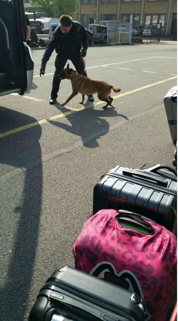 警车前面引路,大巴车紧随其后,半小时后到达警察局院内被告知,所有行李下车。各人推着各自行李箱和随身小包排队,不一会两个警察各牵一只狗来到大车旁,两只警用拉布拉多缉毒犬,一只狗立于远处待命,一只狗马上开始作业。