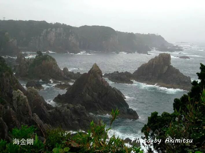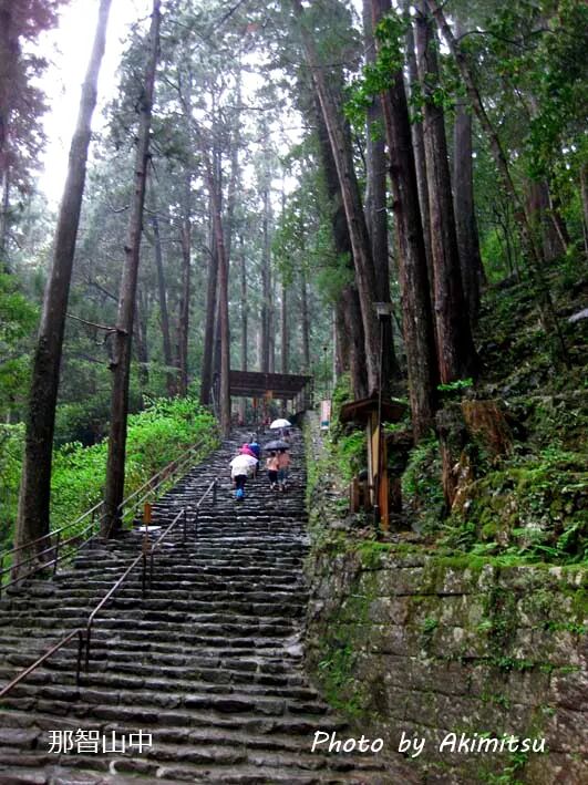 第一天的午餐,白浜名物:海鲜盖浇饭白浜有家店海鮮丼(=海鲜的刺身盖浇饭)很有名,到那儿吃饱了海鲜,我们的车就沿白浜的海边兜风。円月島、千畳敷、三段壁,有名的景点依次经过,有图有真相,恕不赘言。每每停车下来玩儿,车不多人也少,还能听到声声莺啼,真很幸运。天气预报说午后有雨,却迟迟未下。我们玩儿了三段壁回停车场路经一个卖烧烤的小店,见价格便宜,我买了两根烤玉米,(我和小女儿一人一根,W桑不吃)就在这时下起一阵大雨。老板娘热情招呼我们到店里躲雨,我婉言谢绝了。(才买这么点儿东西,哪好意思进店给人家添麻烦。)我们到路口的屋檐下躲雨,一会儿就不下了,W桑去把车开过来,我们坐上车前往下一个景点:本州的最南端——潮岬。一路上雨下下停停,到潮岬时,已过了16:00,明治时代建的那座有名的灯台已关门看不成了,就直接去最南端。我们兴高采烈走过刚被雨水浇湿的大草坪,终于到了最南端的标记前,拍完纪念照,忽地又下起雨来,雨倒不大,风刮得猛烈,让人没法久留。因为下车时还不下雨,三人的三把伞中两把留在车上,仅拿了W桑那把最大的伞以防万一,这下只好小女儿在中间,W桑和我男左女右为她护驾,三人挤着打一把伞走回停车场。大风吹得雨水把衣服淋湿,我们仨也都无所谓,整个大草坪别无旁人,我们就尽情地让笑声飞,让欢乐飞,飞飞飞。乌云密布、风雨交加的大岛是今天最后一个观光点。1791年,他们美国两艘商船从澳门返回西海岸的途中首次到达大岛,这比日本史上著名的Perry黒船来航还早62年。几个冒险商人上陆向日本申请通商,具体地说,就是要把从西海岸先住民那里收来的毛皮卖给日本人。而毛皮在当时的日本没有商业价值,在追讨的武士到来之前,他们美国商船无奈失望地离去。日美两国这场初遇初见,(若详细说,电视连续剧一季说不完)不仅失之交臂,没有擦出国际贸易的星星之火,而且闭关锁国的幕府还讳莫如深,以致不见经传。当然我们的兴趣并不在于参观岛上的日米修交記念館,我们是为观览海金刚一带海岸的风景而来。海金刚海拔数十米高,几个观览点又都在风口上,只能停留一会儿,张望张望就赶紧撤离。(要是连人带伞被狂风吹下大海,再壮烈也轻于鸿毛啊。)最高的一个观览点我们一不怕风二不怕雨上去看了,但因风吹雨斜没拍成照。岸壁下那些被海浪冲打得形状锐利的岩石是各有说法的,可惜我们除了看出一个像金字塔,其他都没看出名堂。离开风口回到内侧的通路,风势雨势都大大减弱。路过日米修交記念館,斜坡上开满白色、粉色、玫瑰色的杜鹃花,与海金刚一带惊心动魄的严峻景色形成鲜明对比,让人一下子心旷神怡了。酒店建在海拔38米的高地上,地点好眺望好,客房正对着大岛,向左可斜望桥杭岩,向右可远眺潮岬,串本町尽收眼底。串本一带的海底拥有世界最北端的珊瑚群,是潜水的好去处。而我们跟潜水无缘,只是要洗温泉。这一带由于有黑潮经过,温泉的爱称就叫黑潮之“湯”(友情提示:不是鱼汤肉汤菜汤的汤),这家酒店男汤叫长寿之汤,女汤叫美人之汤,除了室内的温泉大浴场,还有露天的岩風呂(=岩石砌成的温泉池),清晨可以在露天一边泡温泉一边看桥杭岩的日出。稍事休息后,18:30我们就分别去泡男汤女汤了。美人之汤没几个人,室内的温泉池就我一人独享。透过落地窗看外面,露天温泉没人,树木被风吹得摇动不停,还下着雨,看着就冷,犹豫半天,都走到门口了,也没敢推开门迈出去一步。啊啊,世界上最远的距离,不是从地球到月亮,而是,从门口到露天温泉池。按现今医学常识,汤不能久泡。泡完汤回到客房才19:00,W桑也回来了。我猜W桑肯定要去露天泡汤的。一问,他果然冒着风雨泡了露天的岩風呂,说不冷。懊悔啊我,一定要弥补。晚餐预约了酒店的和式海鲜Course料理,20:00在和式餐厅。W桑到酒店前就喊饿了,盼了两个多小时才开吃,吃了一个多小时,他总算填饱了肚子。晚饭后时间已晚,就寝前我们又分别去泡汤。在室内泡了一会儿我就去露天温泉,世界上最远的距离走着也并不觉冷,几步就进温泉池了。背靠岩石,周围是树木抬头是夜空,身心回归自然,感觉轻松惬意。有几个比我早来的资深美女边泡边聊天,我不打算久泡,心满意足就起身回去了。露天岩風呂,人生一大享受!二,5月1日天气:和歌山又晴又阴又风又雨。观光点:桥杭岩,熊野那智山(世界遗产那智瀑布、那智大社),瀞峡,熊野本宫大社。睡梦中被一阵响声闹醒,等关门的声音响过,房间里才安静下来。想必是W桑去桥杭岩拍日出去了,我估计大概快5:00了。遮光窗帘把外面的光线遮得严严实实,既看不见天色也难判断天气。困得直想睡,迷迷糊糊了好一会儿,却又睡不着,干脆起来掀开窗帘看看,没想到天还没亮,街灯渔火闪闪烁烁,再看表才4:15!Mamma Mia(=艾玛,我原创的中文极简版意译,用东北话念是必须的),这个W桑肯定不到4:00就起床扛着武器业余上岗扫射去了。(旁白:一个上海人,50多岁了,不远万里来到串本,为拍摄桥杭岩的日出,周扒皮家的鸡还没叫就自觉上岗,这是什么精神?)今天的日出时间是5:10,反正睡不着了,我也要等到这个时候从客房的窗口拍桥杭岩的日出。但是可是然而不过,天空布满了云,桥杭岩的黎明没有一丝曙光,更没有日出。从5:00~5:15,我每隔5分钟依次拍几张桥杭岩、大岛和潮岬,期待一轮旭日忽地从海平面升起。可惜奇迹没有出