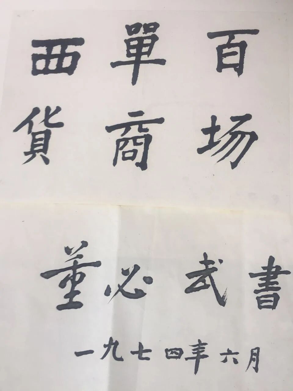 没过几天,齐一飞给父亲来电话说,董老已欣然承诺,同意“挥毫泼墨”。到了六月,董老题写了几幅,齐一飞和父亲高兴地去挑选,并代表西城区人民群众向董老致以崇高的敬意。不久,“西单百货商场 董必武(書)”几个大字便矗立在了西单百货商场的大门口。
