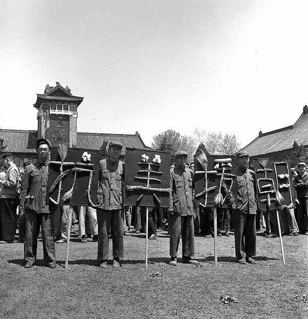 1951年5月1日,金陵大学工会全体会员出发参加五一劳动节游行,农学院的标语与众不同,用农作物制成的"抗美援朝"。孙明经摄