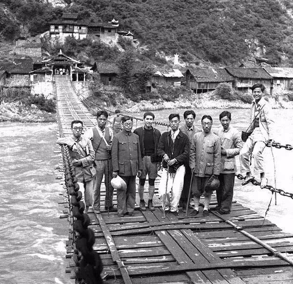 1939年7月,川康科学考察团地理组在泸定桥上留影,左五为孙明经。孙明经摄