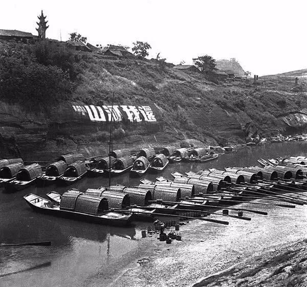 1938年4月,四川自贡,釜溪河中的运盐船及岸边崖坡上的“还我河山”的标语。孙明经摄