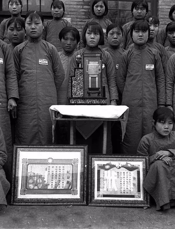 1937年3月,烟台蚕丝改良委员会青年女工工读学会与所获奖状合影。孙明经摄