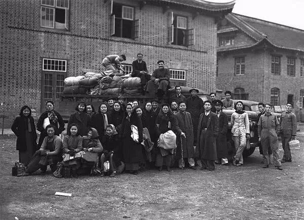 1946年1月,四川成都,抗战胜利后金陵大学师生分批复员南京,第一批复员回南京的金陵大学师生出发前在成都华西坝留影。孙明经摄
