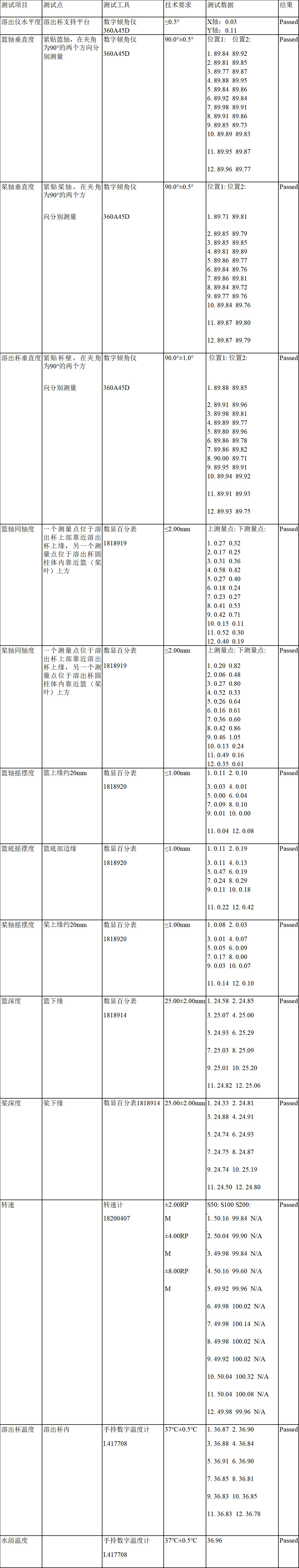再来看看深圳华溶某型号溶出仪机械验证结果: