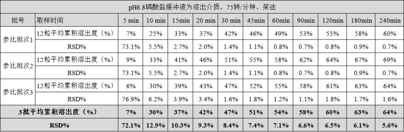 如下为熊去氧胆酸胶囊在pH6.8磷酸缓冲液,75转/分钟,桨法条件的溶出数据。客户检测了参比制剂3批,自研批次3批,每个批次均为12单位制剂,取样时间点为11个。分别比较了批内差异、批间差异。数据可见,产品批内以及批间差异小。