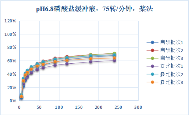 熊去氧胆酸胶囊3批自研产品和参比批次溶出曲线对比(pH6.8,桨法75转/分钟)