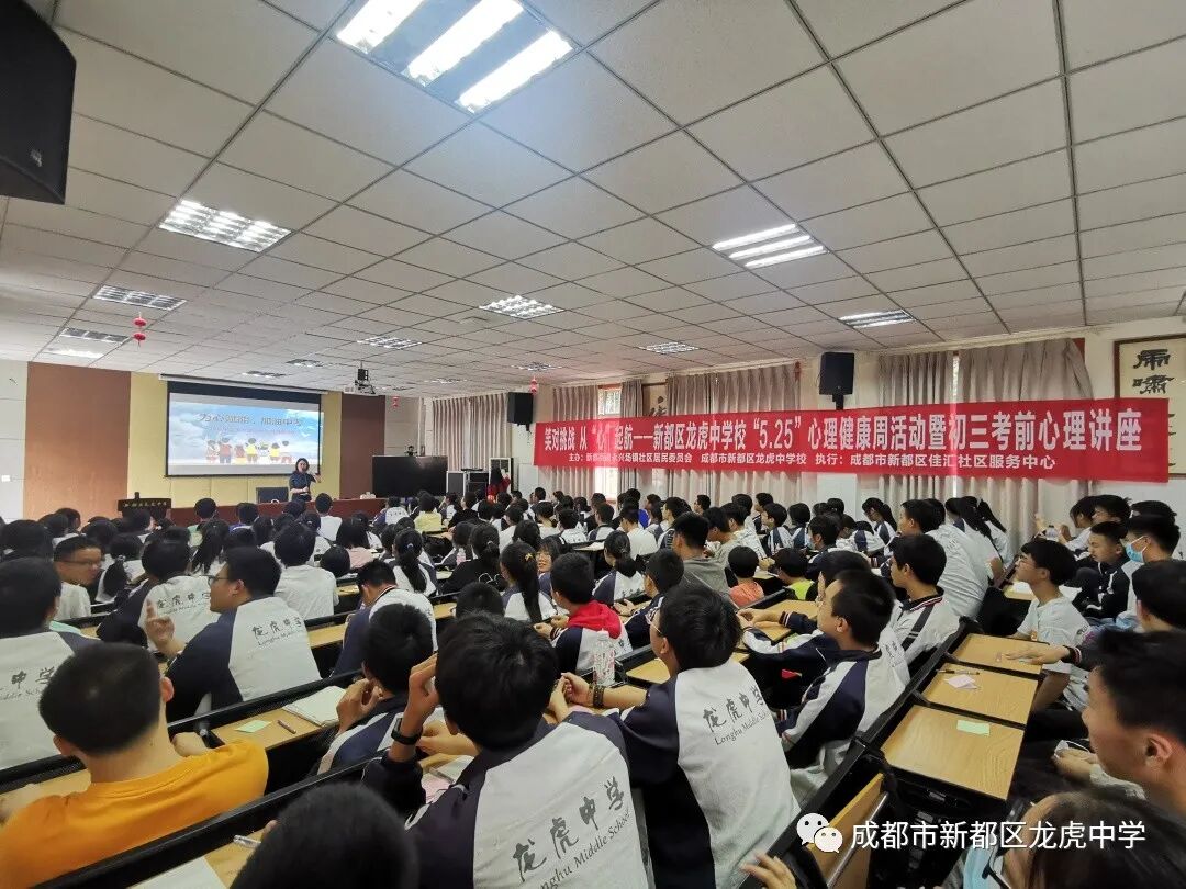 在这样一个意义重大的日子里,为了缓解九年级学子紧张的焦虑情绪,帮助孩子们调适良好的考前心态,5月25日下午龙虎中学特邀成都市新都区教科院林瑛老师到学校开展考前心理调试讲座,九年级全体师生参加本次活动。