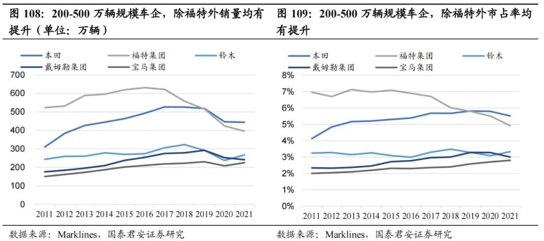 二线头部车企全球市占率均有提升(除福特外)。本田、福特集团、铃木、戴姆勒集团(梅赛德斯-奔驰集团)、宝马集团销量达200-500万,为头部车企第二梯队。本田、铃木、戴姆勒、宝马由于抓住中国、印度两大新兴市场,充分享受了增长红利,市占率不断提升。
