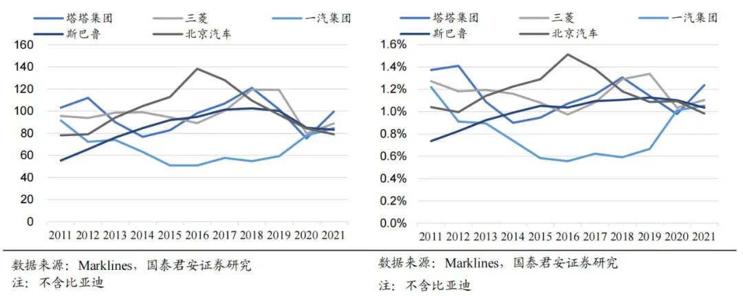 销量排名靠后的车企各有起落。塔塔集团、三菱、一汽集团、斯巴鲁、北京汽车销量为50-100万,在全球主要车企中排名靠后。2011-2021年间,未能形成连续的上升势头。