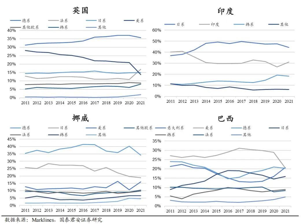 分区域来看,本土车企强势的国家(以下简称本土强势国)各车系份额基本稳定,本土车企弱势的国家(以下简称本土弱势国)各车系份额变化剧烈。近10年在德国、法国、日本、韩国等本土强势国市场,各车系份额变化不大,而在英国、印度、挪威、巴西等本土弱势国,车系份额变化剧烈,市占率第一常常易主。