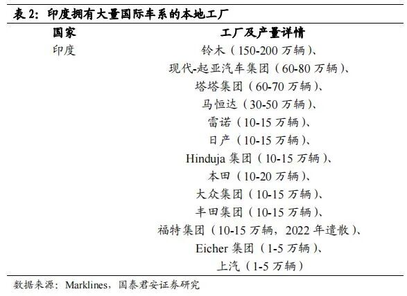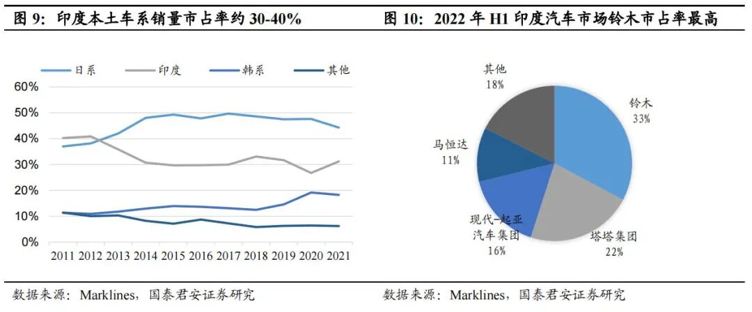 印度汽车年销量约300-400万辆,日系、本土车系占比高。2021年日系销售167万辆,占45%;本土车系销售117万辆,位列第二。车企排名来看,马鲁蒂铃木(铃木在印度的合资公司)市占率第一,印度本土车系塔塔集团、马恒达排名靠前。