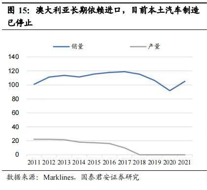 大洋洲汽车产能较少。澳大利亚已停止汽车制造,目前100万辆的汽车市场全部依赖进口。