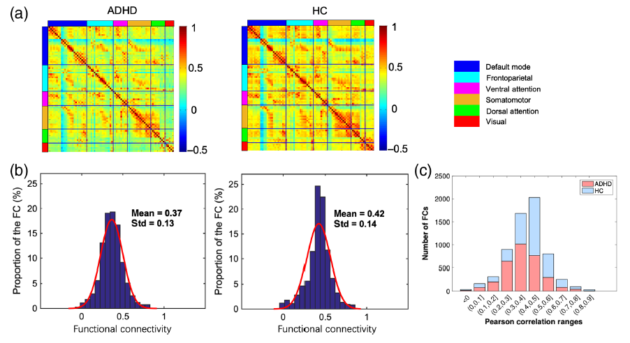 此前,北京大学第六医院与北京师范大学联合发表了高水平论文[1],该研究利用慧创fNIRS设备通过80通道,覆盖了额叶,枕叶和顶叶,对患有注意缺陷多动障碍(ADHD)的儿童与成年人进行全脑静息数据分析,并将测量通道分为六个网络:视觉网络(VN),体感网络(SMN),背侧注意网络(DAN),腹侧注意力网络(VAN),额顶网络(FPN)和默认模式网络(DMN)进行研究。结果揭示了行为障碍可能是儿童ADHD持续到成年的影响因素,为多动症的大脑发育提供了证据。(图2)