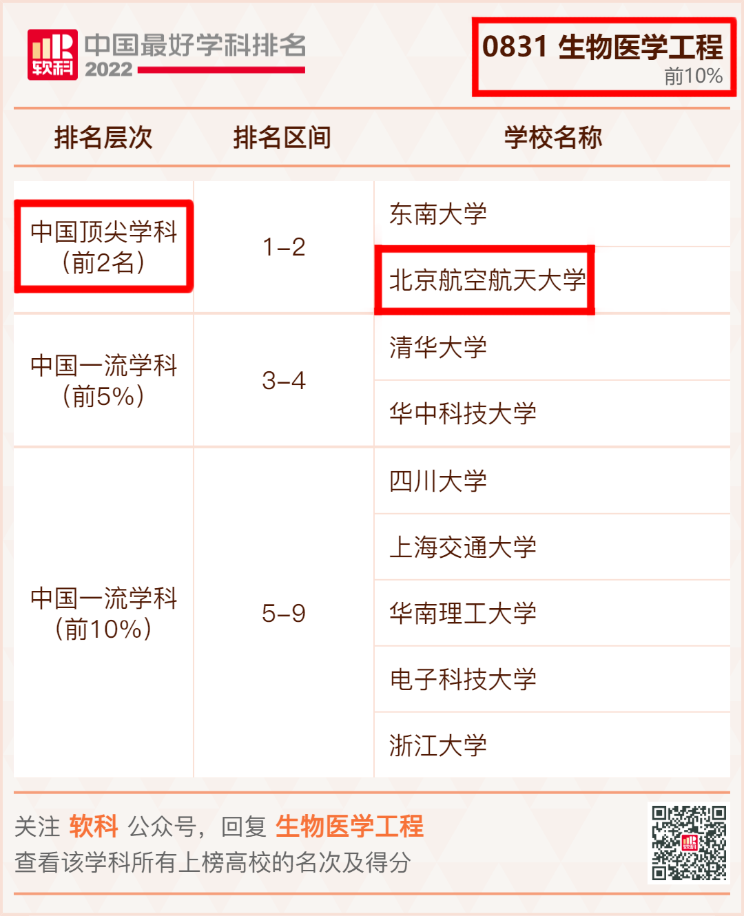 9月21日,高等教育评价专业机构软科正式发布“2022软科中国最好学科排名”。慧创近红外源起单位——北京航空航天大学生物医学工程学科在此次排名中,作为中国顶尖学科,位列全国Top2!