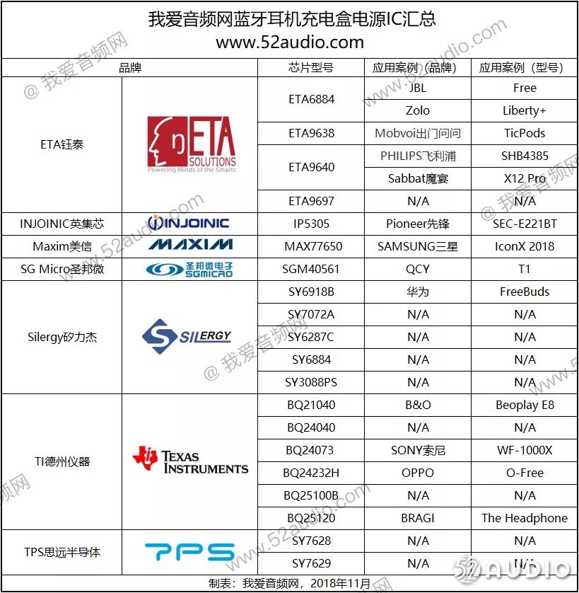 据我爱音频网统计,目前共有7大主流充电盒电源IC厂商,20款主流电源IC。接下来我们带大家一起了解目前市面上主要几款TWS真无线蓝牙耳机的充电盒电源管理IC(按品牌名称首字母排序)。