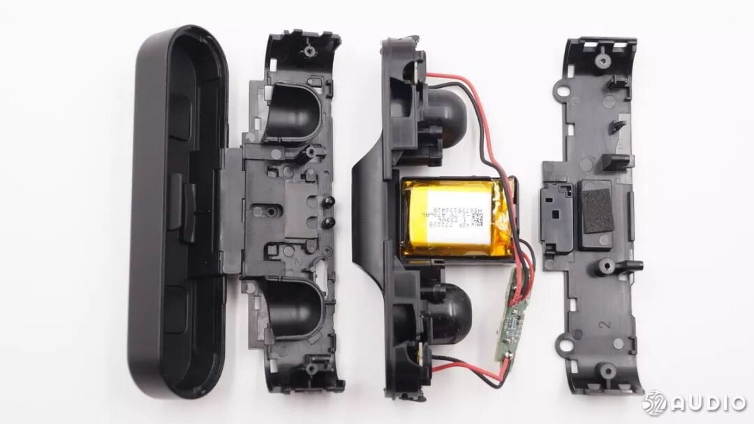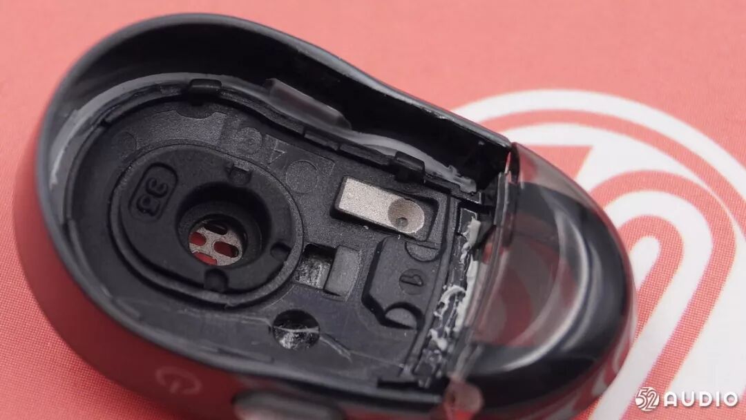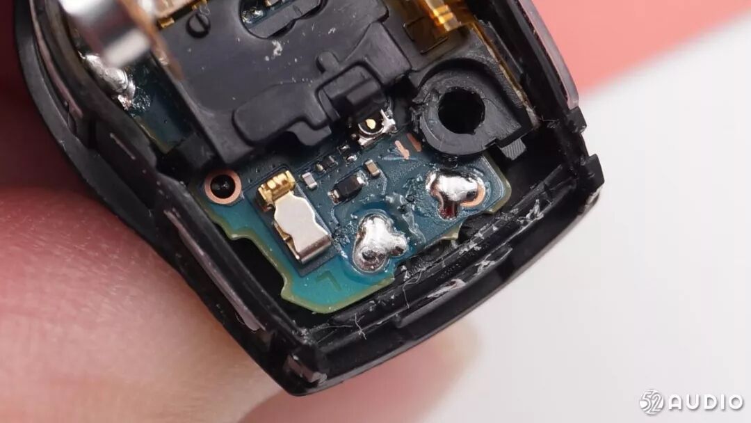 据我爱音频网拆解分析,以上两张图片为壳体内的电池正负极触点,两个焊点是去到耳机扬声器的。