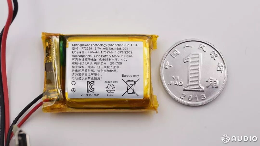 内置锂聚合物电池型号:772229,470mAh。与一角硬币差不多宽。