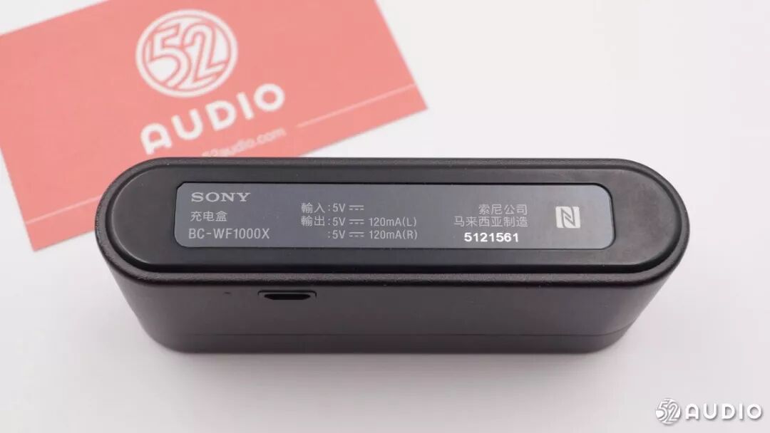 充电收纳盒背面标签标注了输入输出信息。SONY 充电盒,型号:BC-WF1000X,输入5V DC,输出5V 120mA(L)、5V 120mA(R),索尼公司,马来西亚制造。最右侧为NFC标志,表明这款充电盒支持NFC一触配对连接。