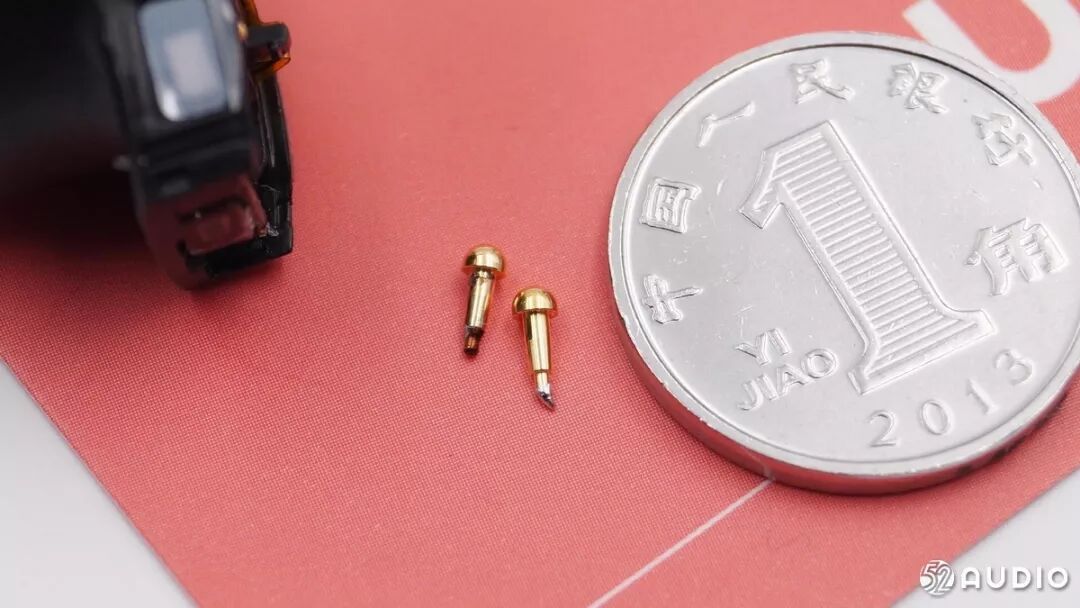 打开电池盒看到耳机光滑的表面,耳机上面很明显的两个金属拾音器孔。