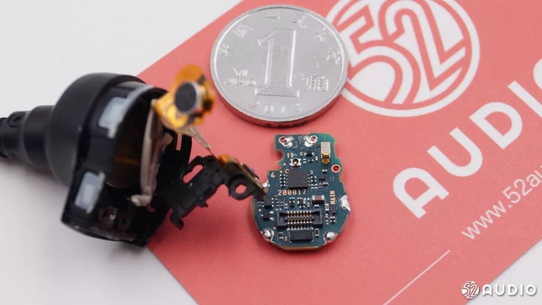取下屏蔽罩,实际上电路板非常小,我爱音频网将其与1角硬币对比发现,电路板比1角硬币还小。