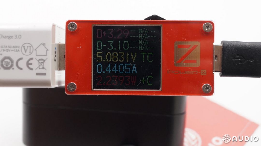 使用ChargerLAB POWER-Z KT001对充电盒进行充电测试,测得电压为5.08V,电流为0.44A。