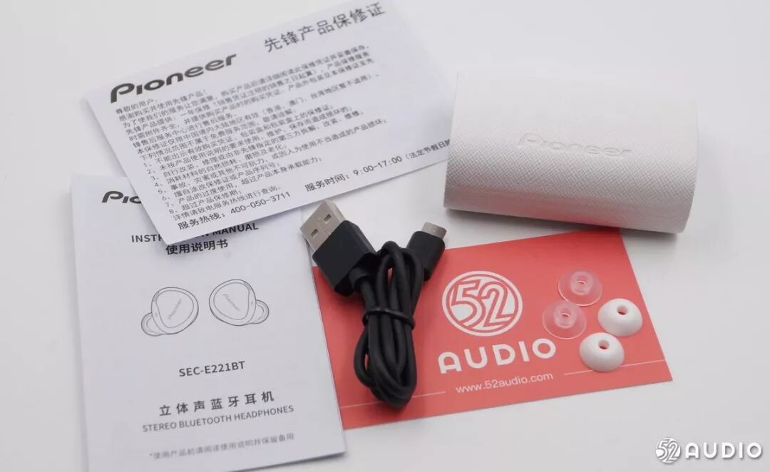 随行充电盒侧面有简单的耳机信息:立体声蓝牙耳机 型号:SEC-E221BT,先锋(中国)投资有限公司出品,中国制造 Made in China。