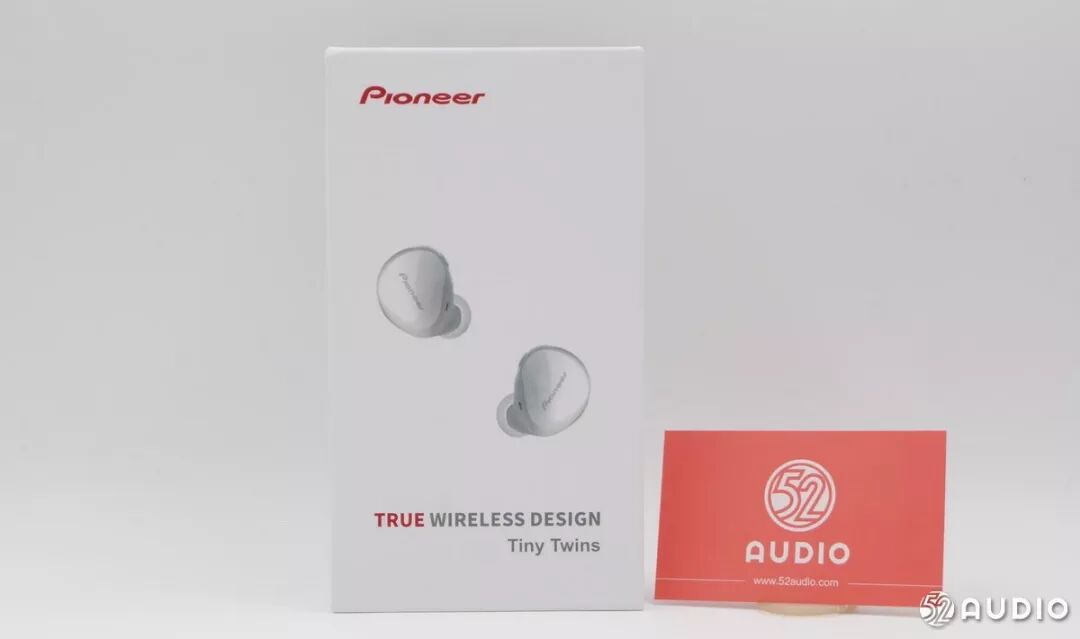 简约的外包装,整体上白色底色,先锋的Pioneer Logo置于左上角,中间是产品的效果图,下面有“TRUE WIRELESS DESIGN” Tiny Twins 表明这款耳机是TWS真无线。
