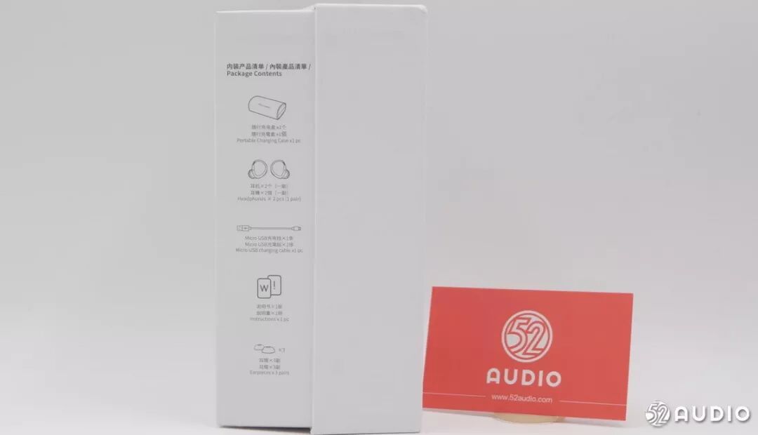 另一面列出了包装内容:随行充电盒一个、耳机一副、Micro USB充电线1条、说明书一份、耳帽3副。