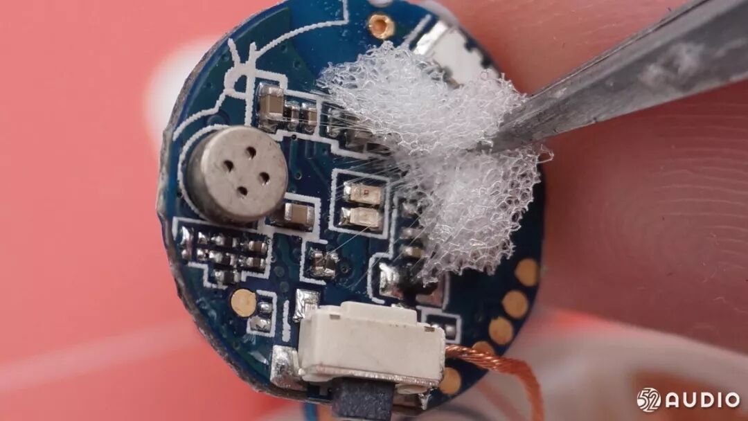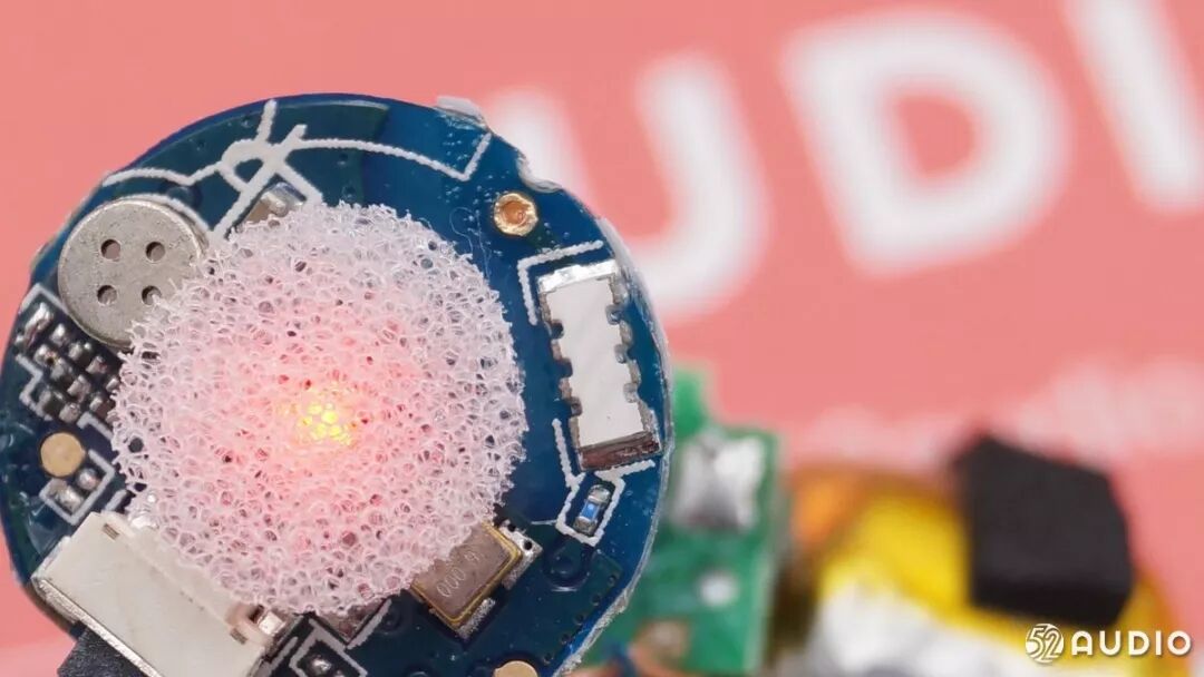 据我爱音频网分析,表面的这块海绵,一方面达到减震效果保护PCB板,另一方面LED灯透过这块海绵可以产生柔光效果。