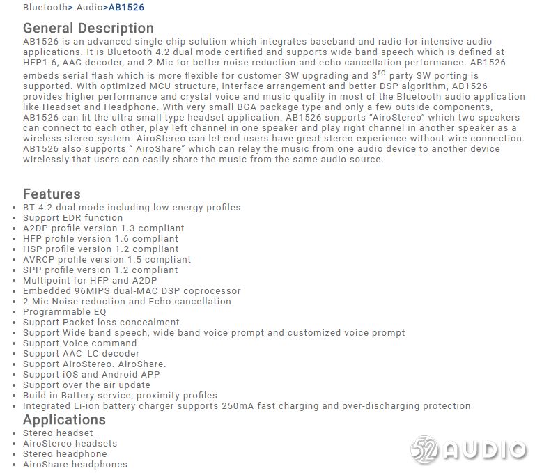 据我爱音频网拆解,这款先锋SEC-E221BT采用络达 AB1526 单芯片解决方案,内部集成了SPI内存,支持蓝牙4.2双模认证。