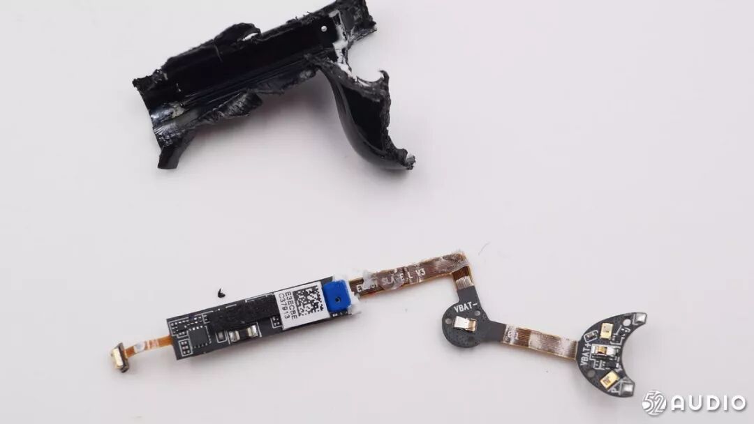 拆出电路板,蓝色的是降噪麦克风,右侧两个弹片触点分别对应电池正负极。