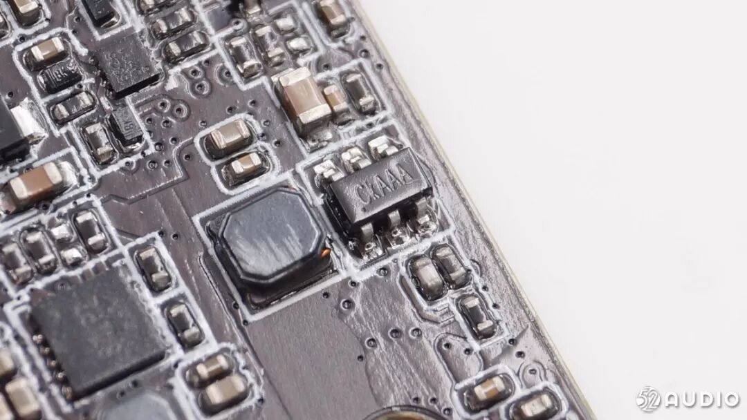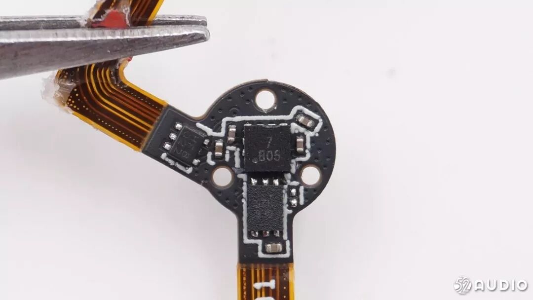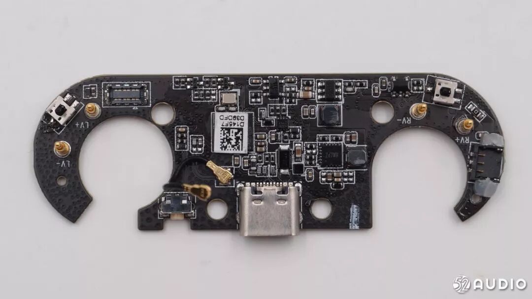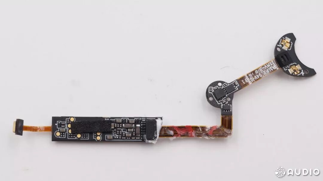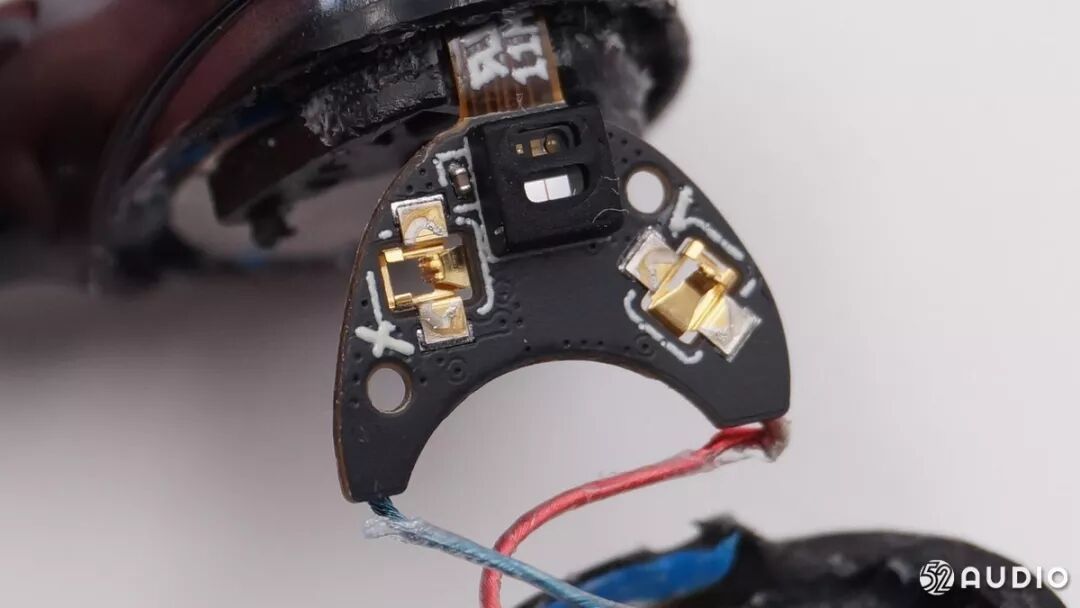 另外一面是充电触点和红外线距离传感器,是来自捷腾光电的JSA-1218红外线距离传感器,是目前市面上封装体积最小的红外线距离传感器。它的检测测距离最近能达到0.5mm,可以更加准确地检测到耳机的佩戴情况。