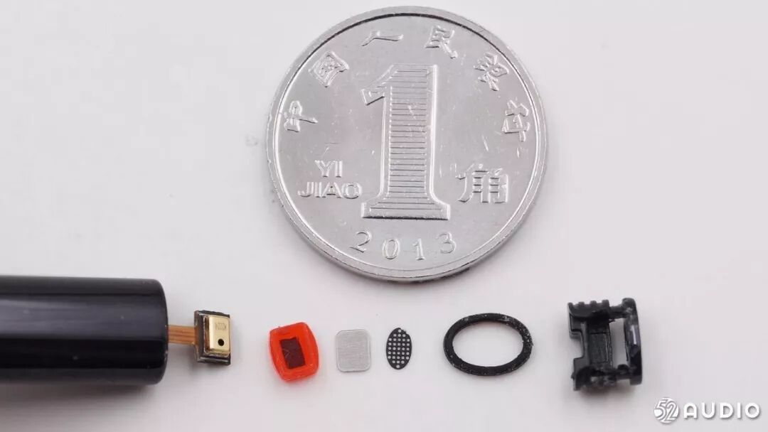 麦克风这边的组成部分和一角硬币对比大小。