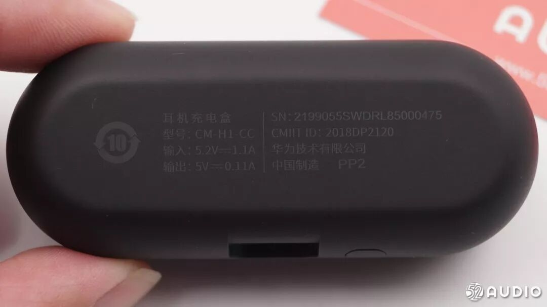 耳机充电盒背面是详细参数,耳机充电盒的输入是5.2V 1.1A,耳机盒对耳机充电时输出5V 0.11A。