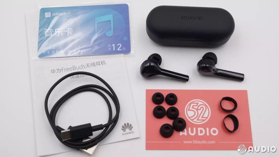 华为FreeBuds的全部配件,配送了一根USB Type-C充电线一个耳机圈和3副耳机套,还有一张华为音乐卡。