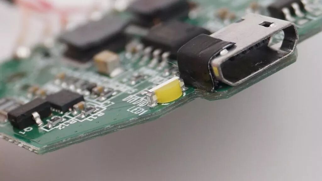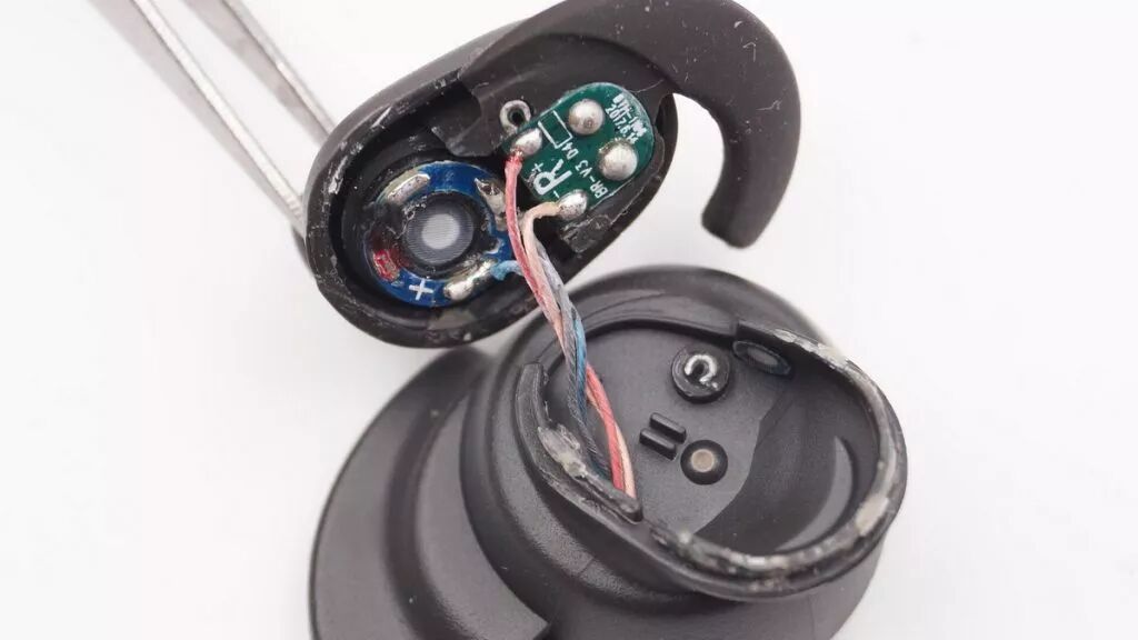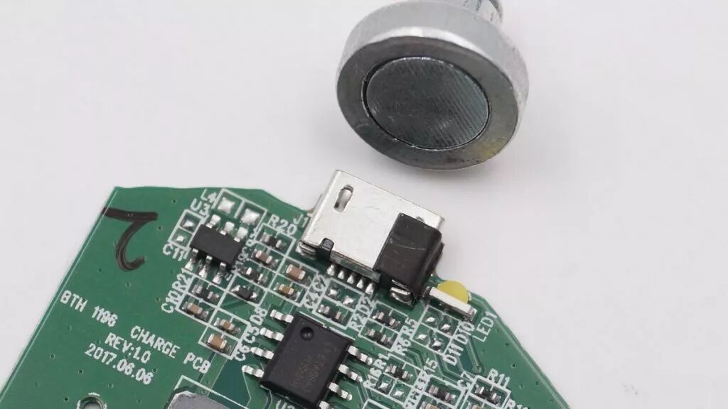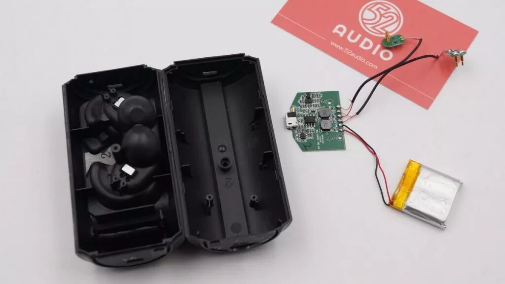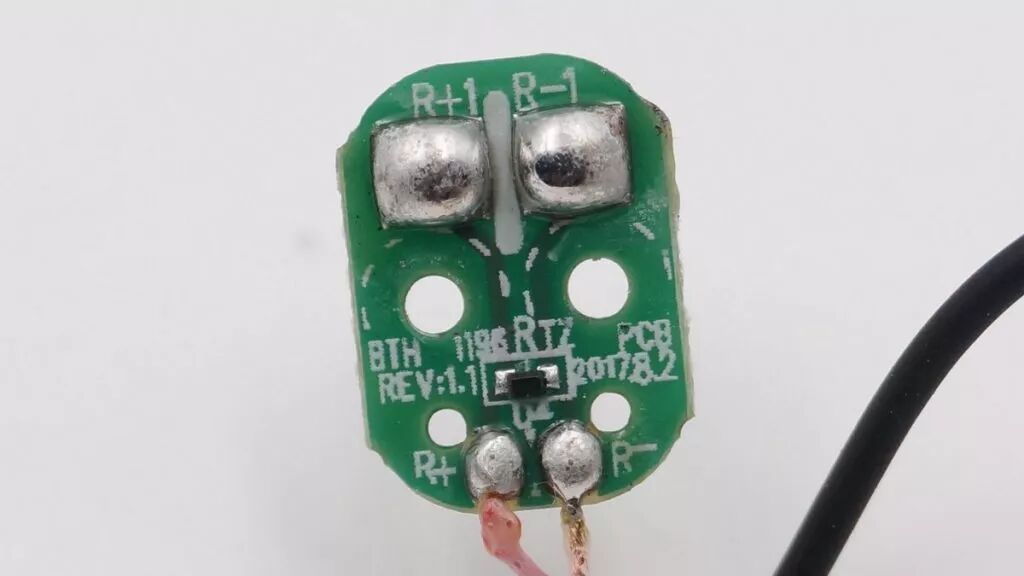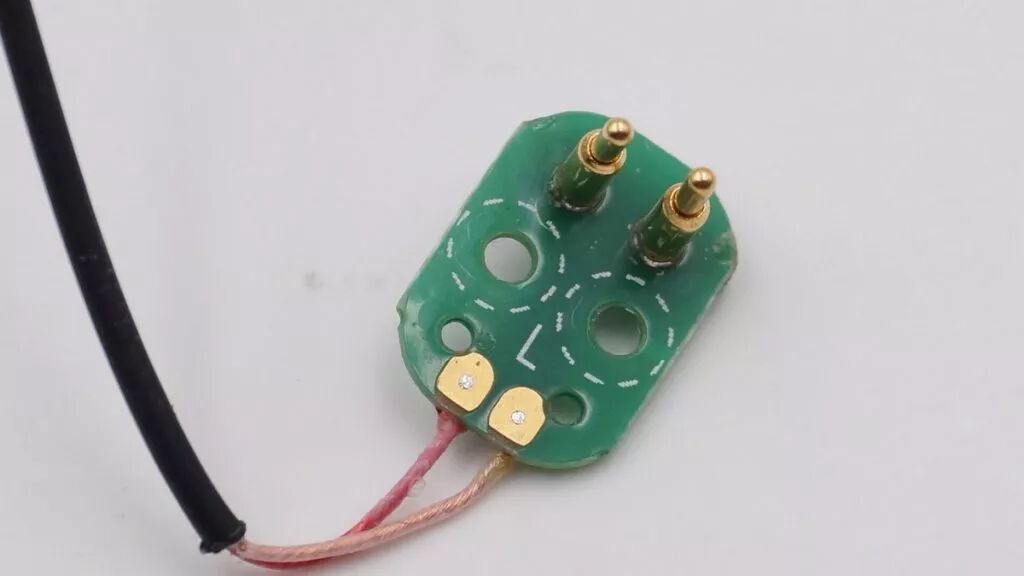 两根导线连接到PCB,通过铜触点给耳机充电。