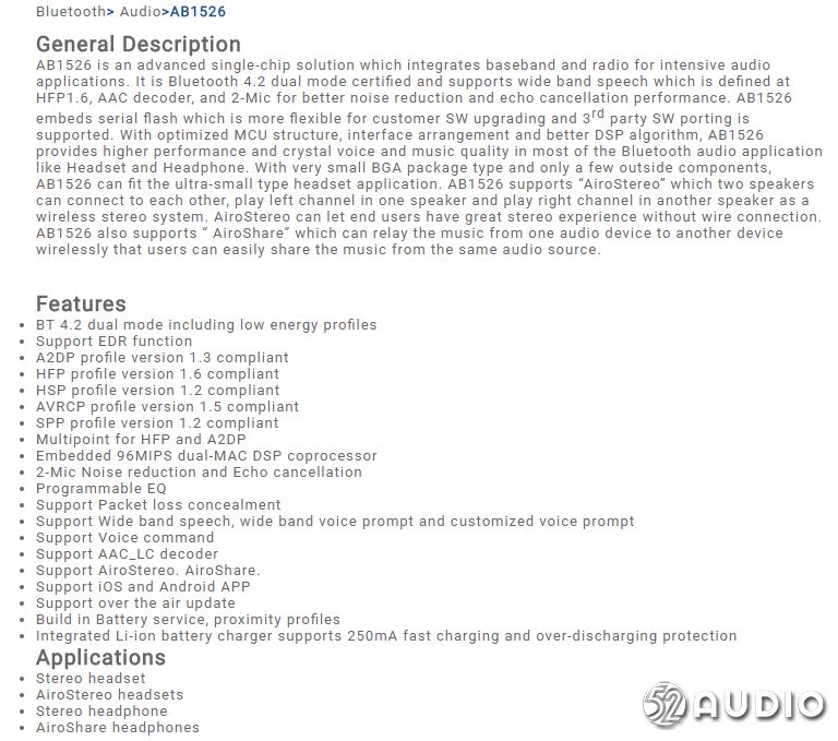 据我爱音频网拆解分析,这款PHILIPS 飞利浦SHB2426 使用络达 AB1526 单芯片解决方案,内部集成了SPI内存,支持蓝牙4.2双模认证。通过我爱音频网拆解发现ZOLO Liberty+ 、先锋SEC-E221BT等知名厂商都选用了这颗芯片。