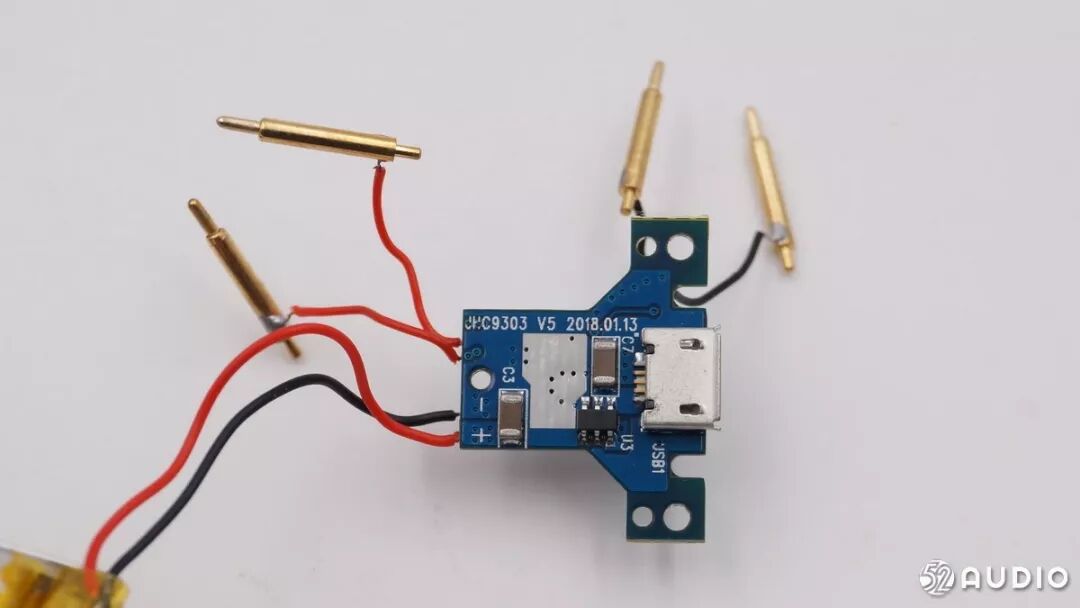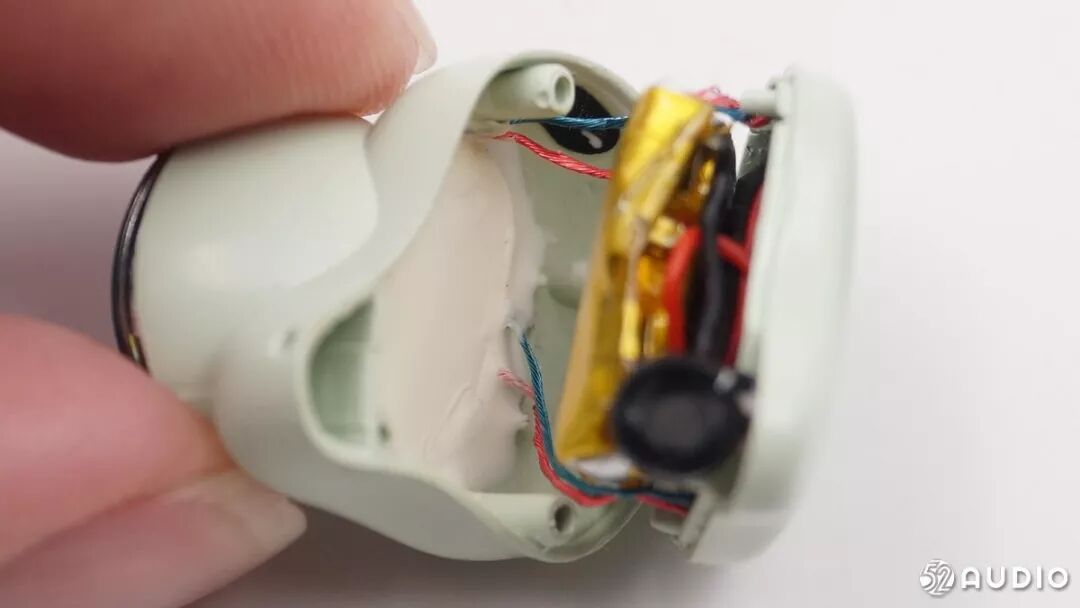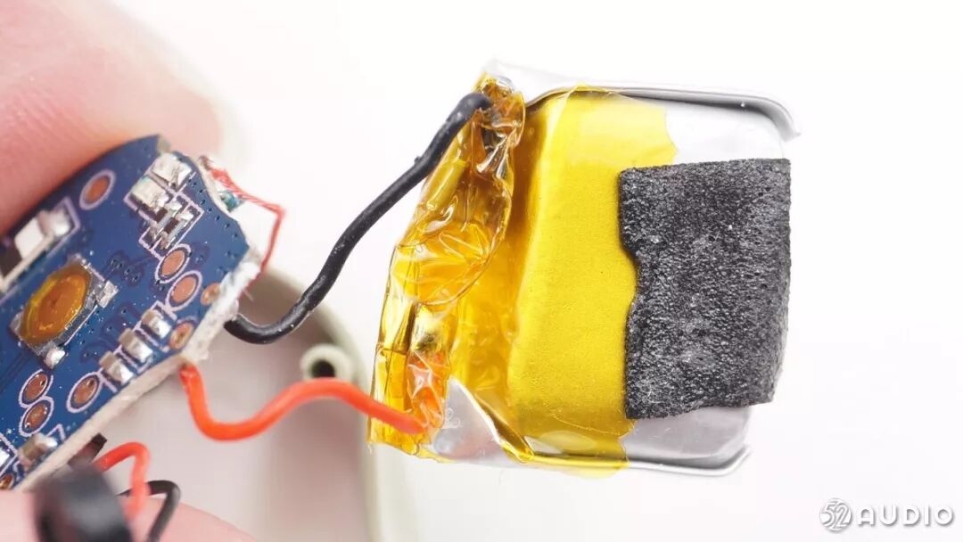 接下来从背盖处打开耳机,可以看到电池和主板,以及连接扬声器的导线。