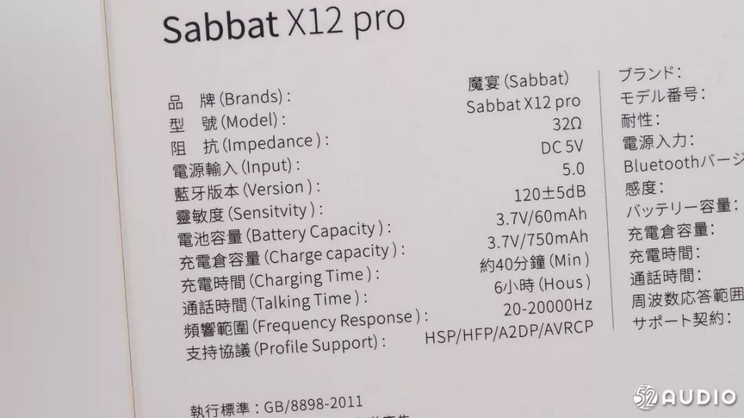 Sabbat X12 Pro,品牌:魔宴(Sabbat),型号:Sabbat X12 pro 阻抗:32Ω 电源输入:DC 5V,灵敏度:120±5dB,耳机电池容量:3.7V/60mAh,充电仓容量:3.7V/750mAh。