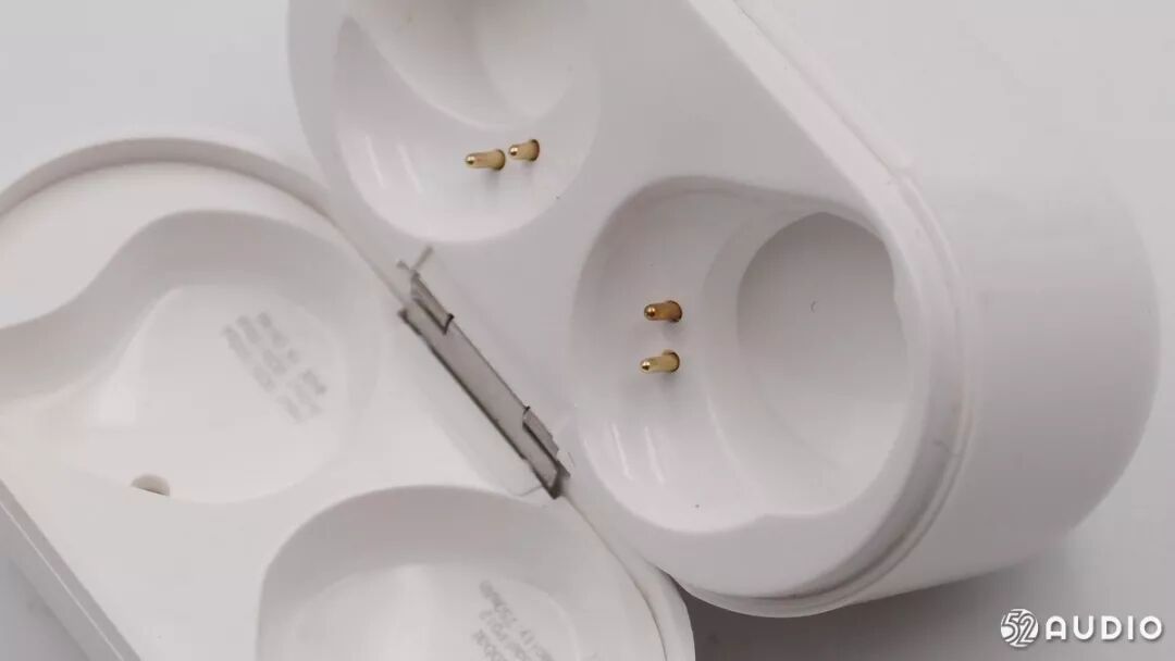 打开盖子之后,耳机平躺在盒子中,并且在耳机LED灯的对应充电盒盖子的位置有开孔,这样的话合上盖子也能看见耳机是否在充电。